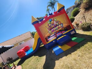 A maximum of 5-6 kids of equal size at one time for bounce houses, and 1 person at a time for slides is what most inflatable manufacturers recommend.